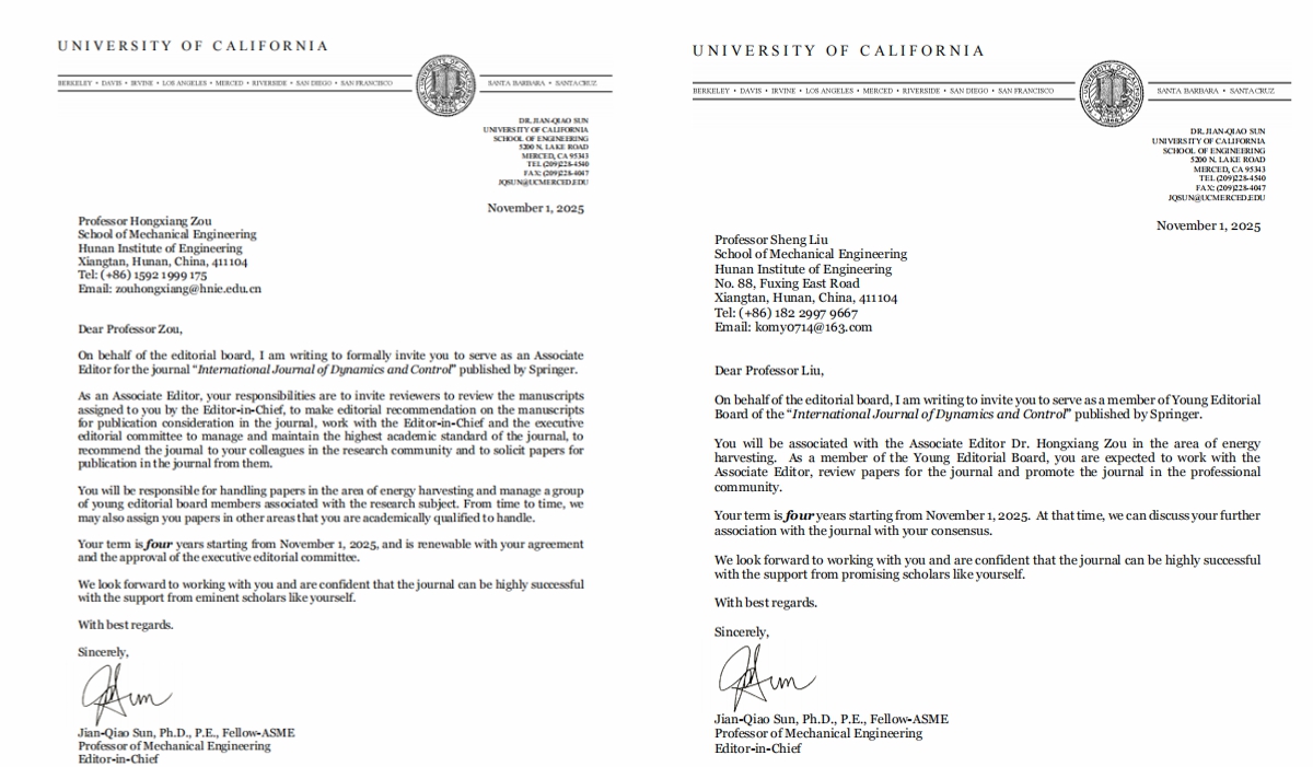 《International Journal of Dynamics and Control》是动力学、振动与控制领域具有重要影响力的国际期刊,致力于发表该领域前沿研究和工程应用的重要成果。两位教师受邀担任期刊学术职务,不仅是对其个人学术水平和声誉的肯定,更将为诸侯快讯官网动力学与控制研究领域搭建更广阔的国际学术对话平台,助力学院精准对接国际前沿方向,深化与海外高水平团队的合作,推动学科成果走向国际舞台。