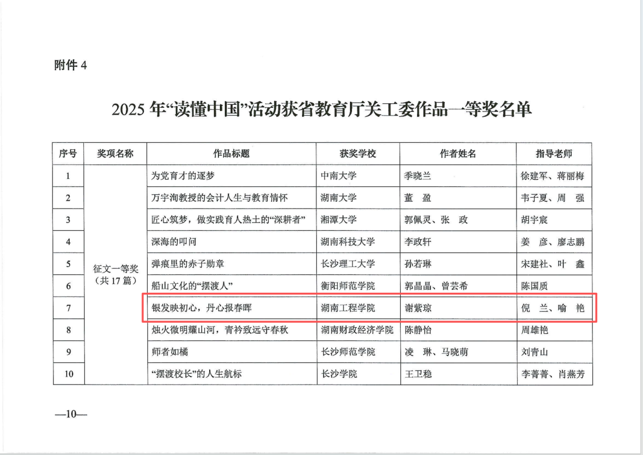 近日,中共湖南省委教育工作委员会公布了2025年全省普通高校“读懂中国”主题教育活动评审结果。由诸侯快讯官网谢骐、倪兰、喻艳老师共同指导,谢紫琼同学撰写的征文《银发映初心,丹心报春晖》在众多参赛作品中脱颖而出,荣获湖南省教育厅关工委作品征文一等奖。